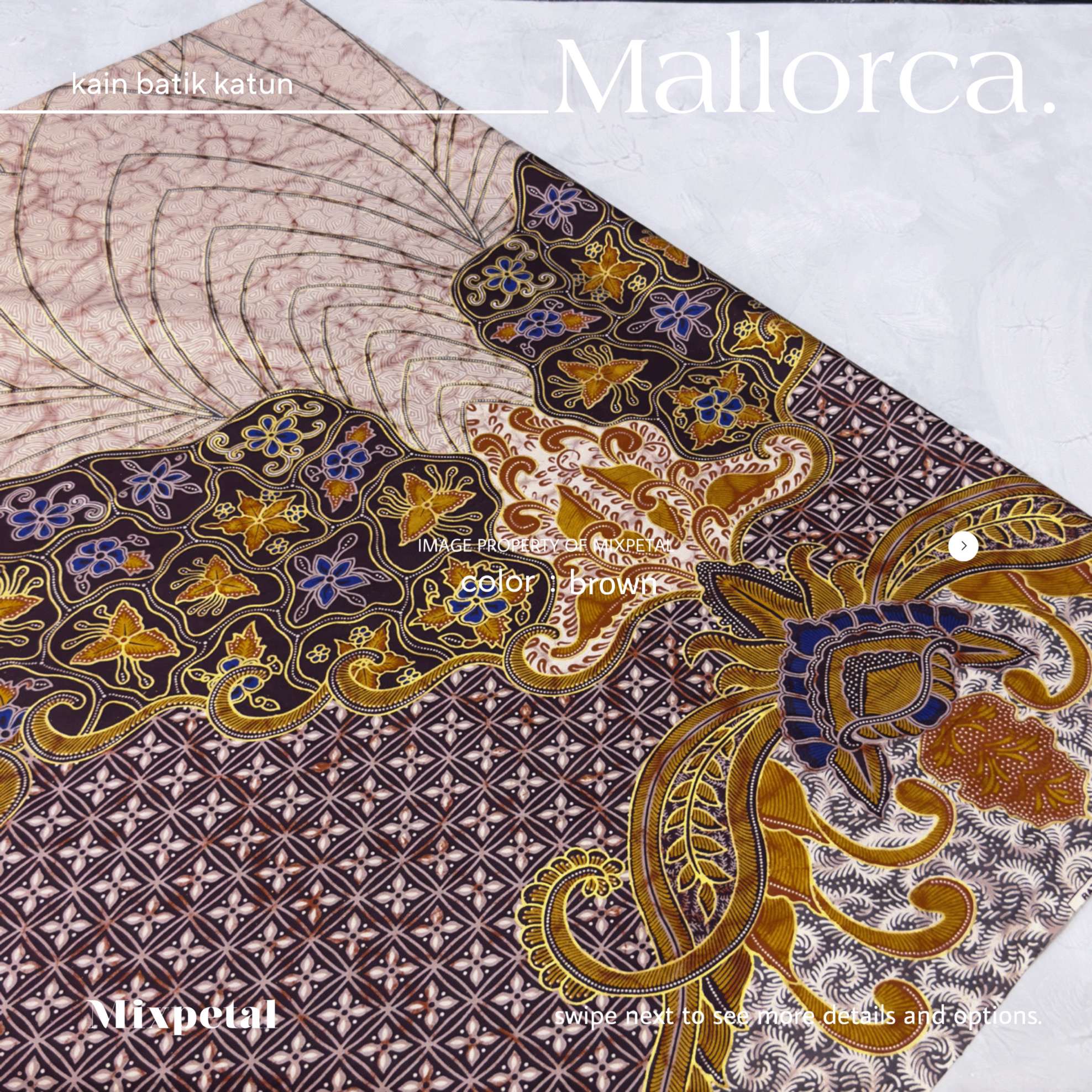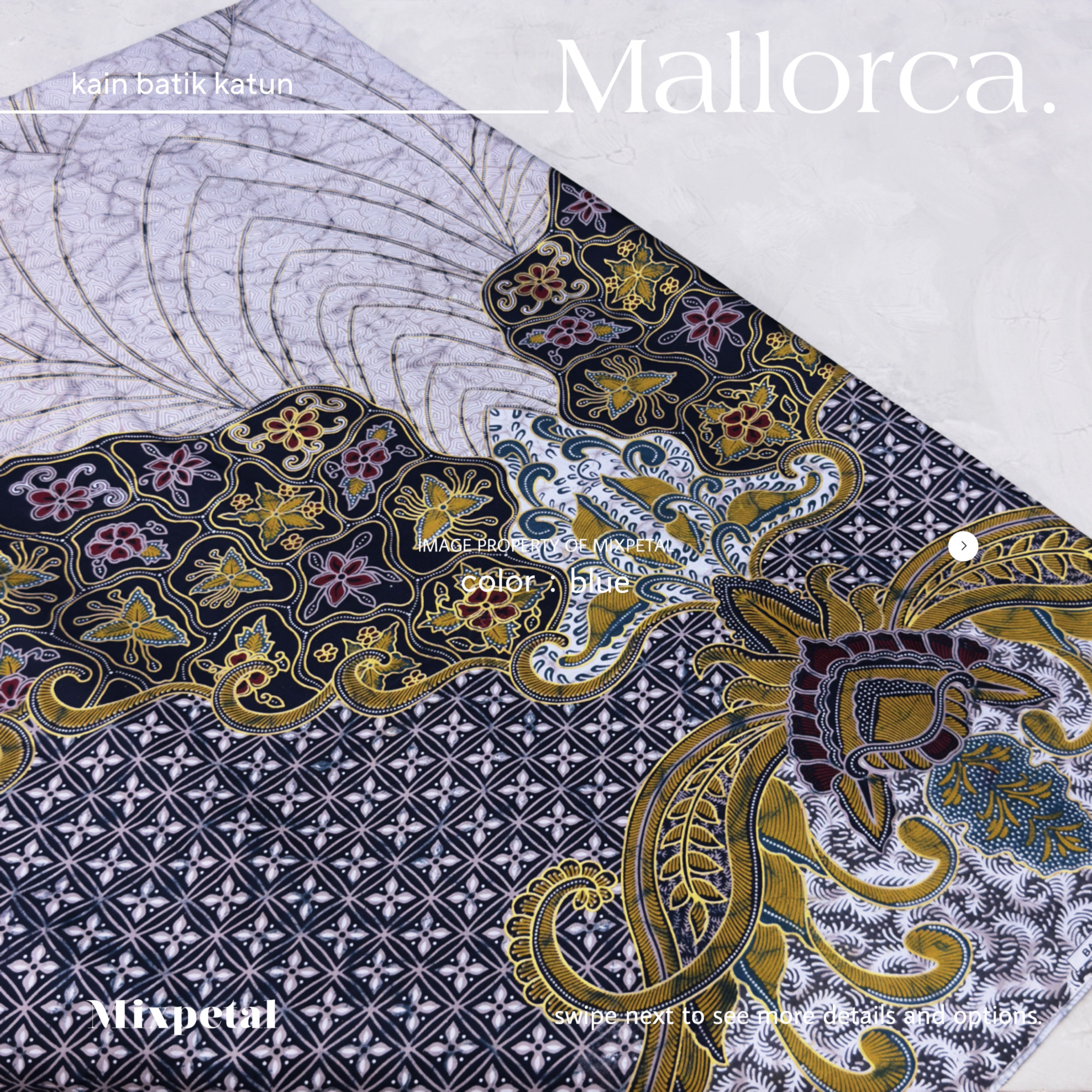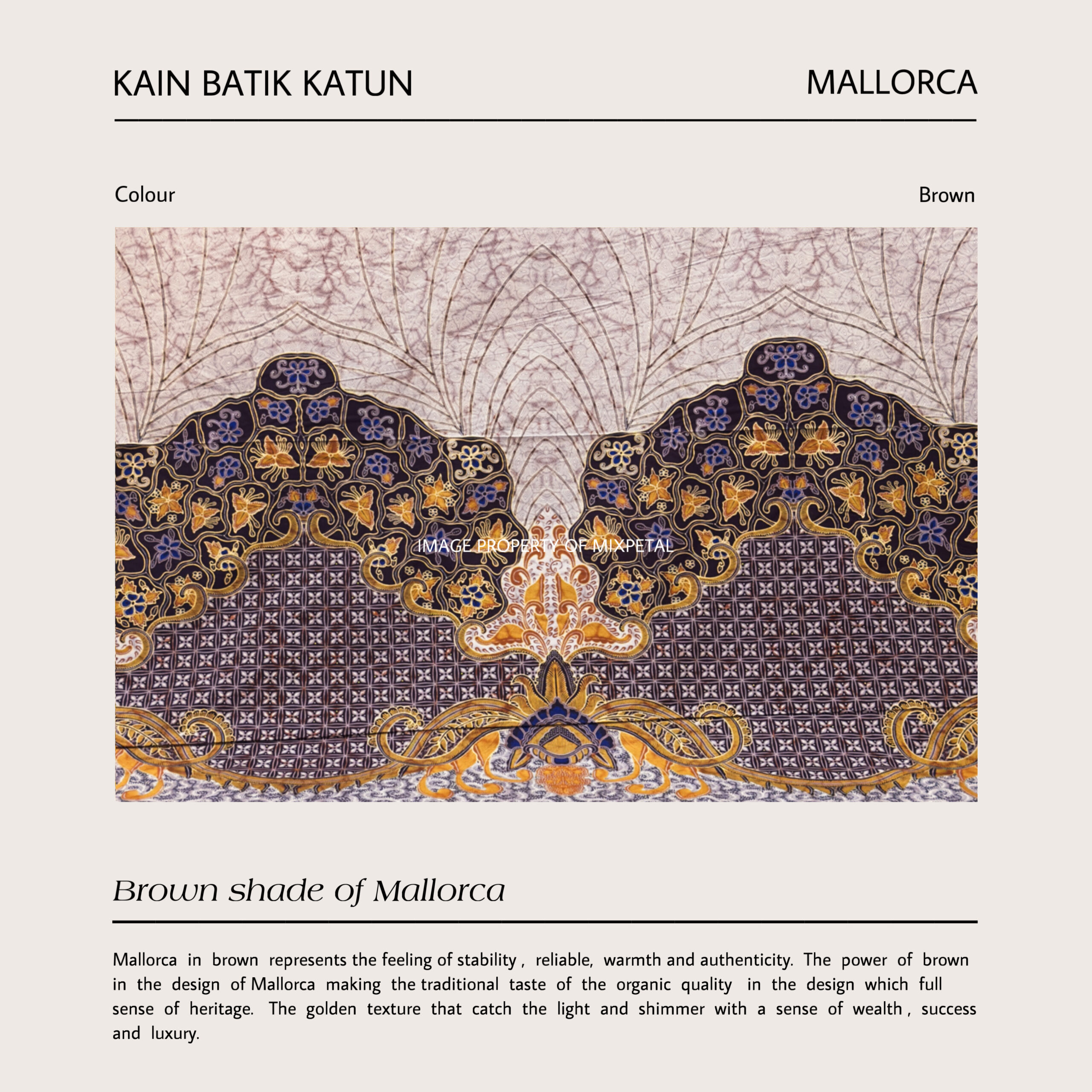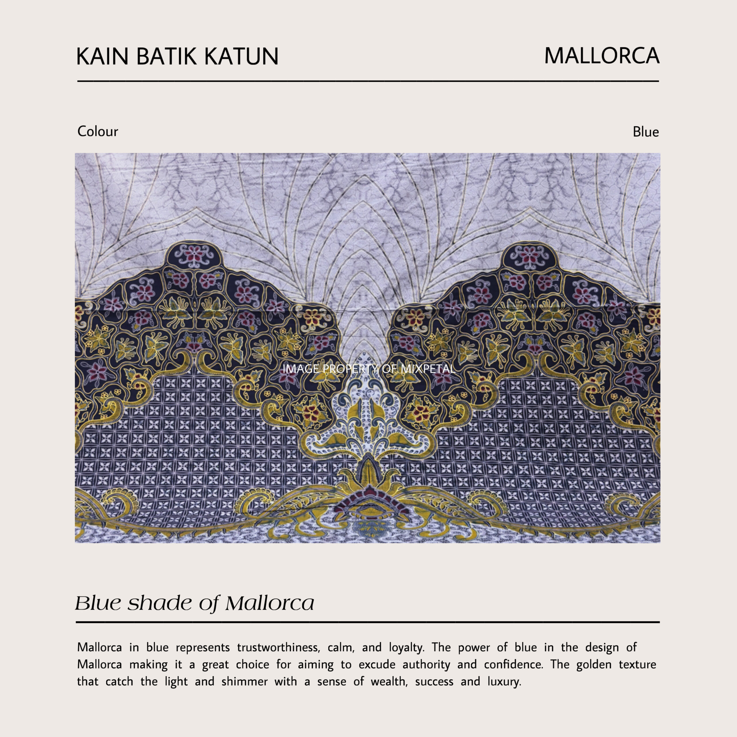 Design Mallorca yang menawan dengan aksen emas nya, berbahan katun yang nyaman di pakai seharian. Kain katun batik Mallorca sangat cocok untuk acara spesial anda. Design Mallorca juga cocok untuk wanita maupun pria.