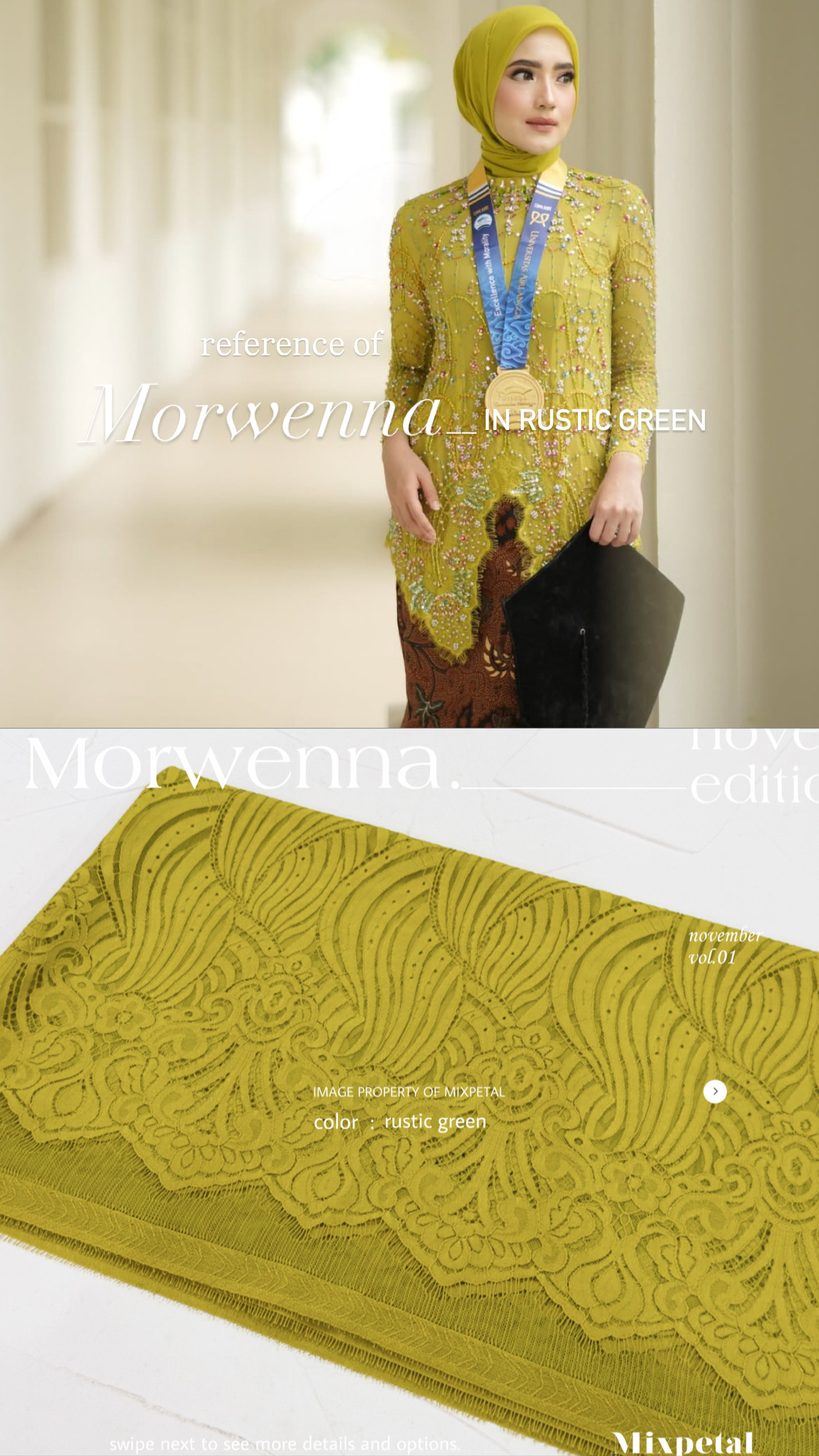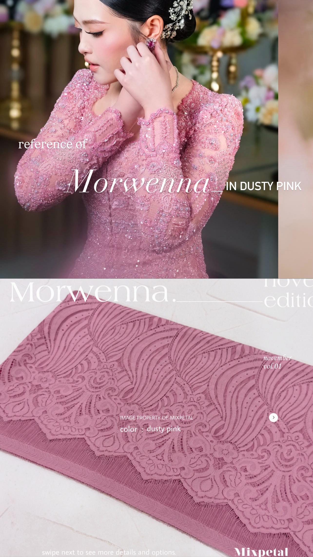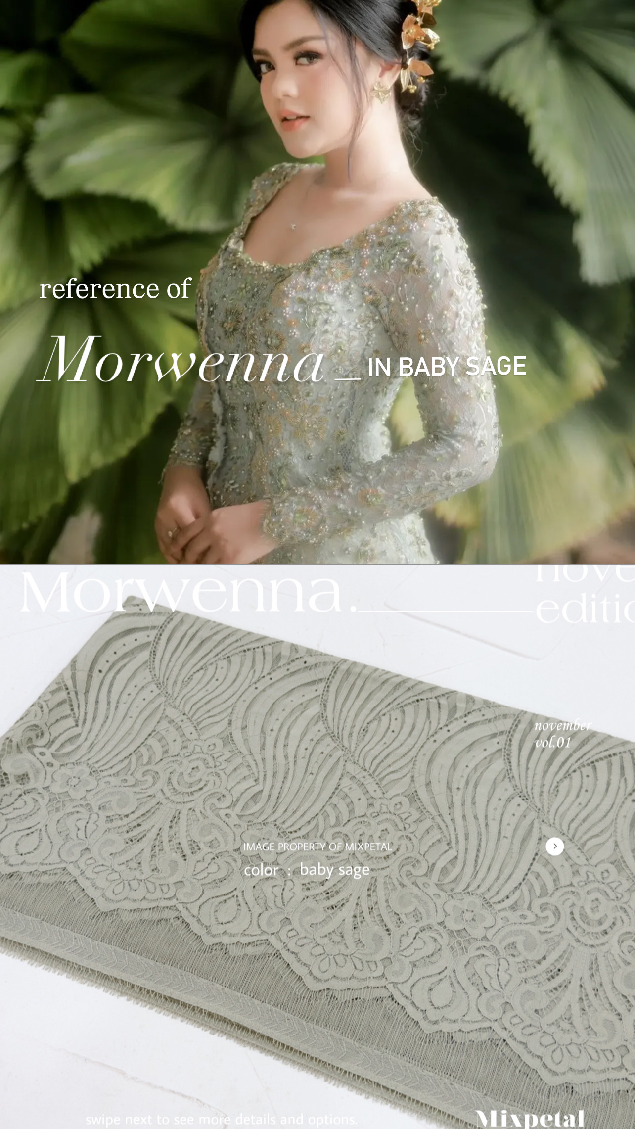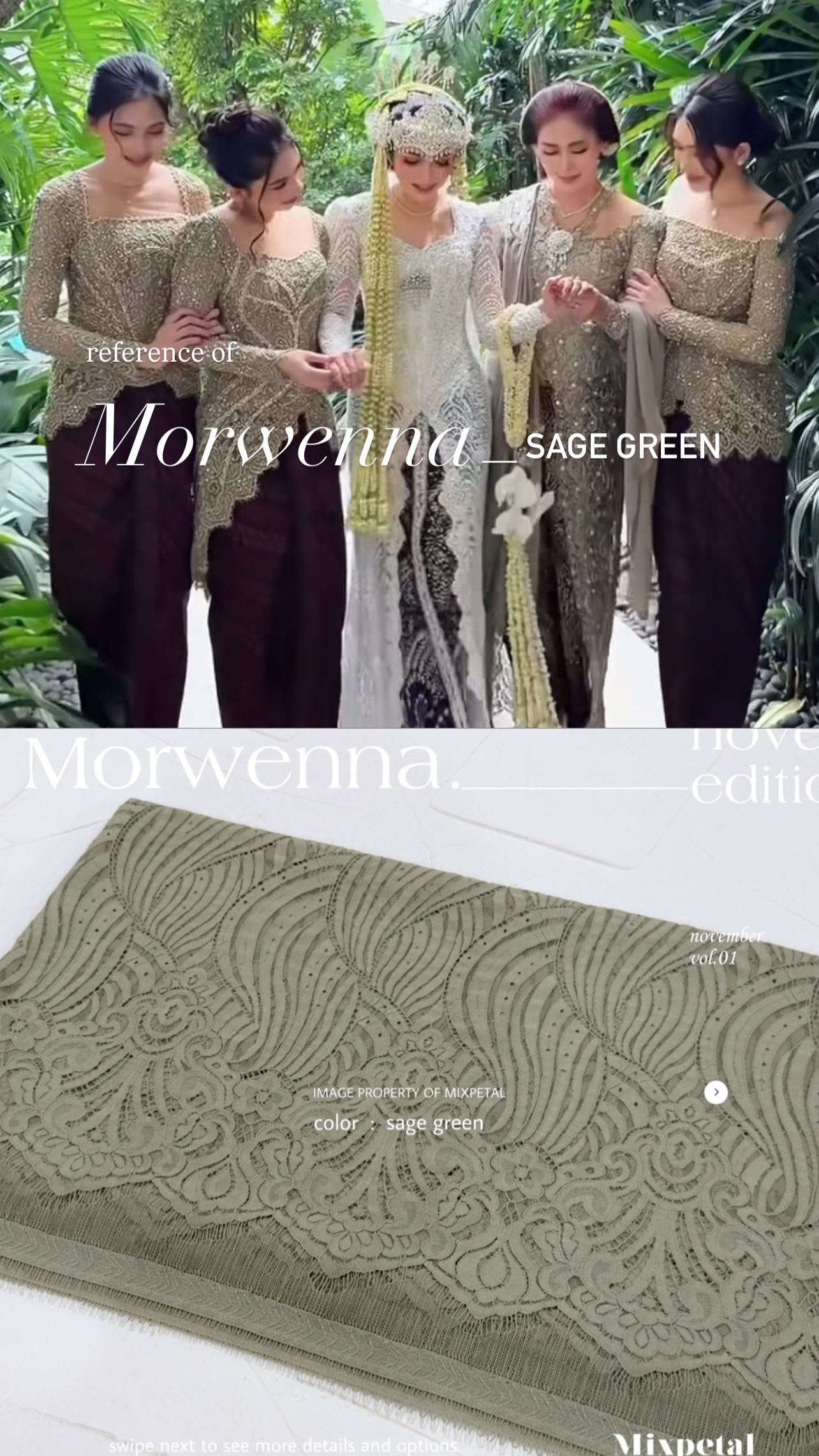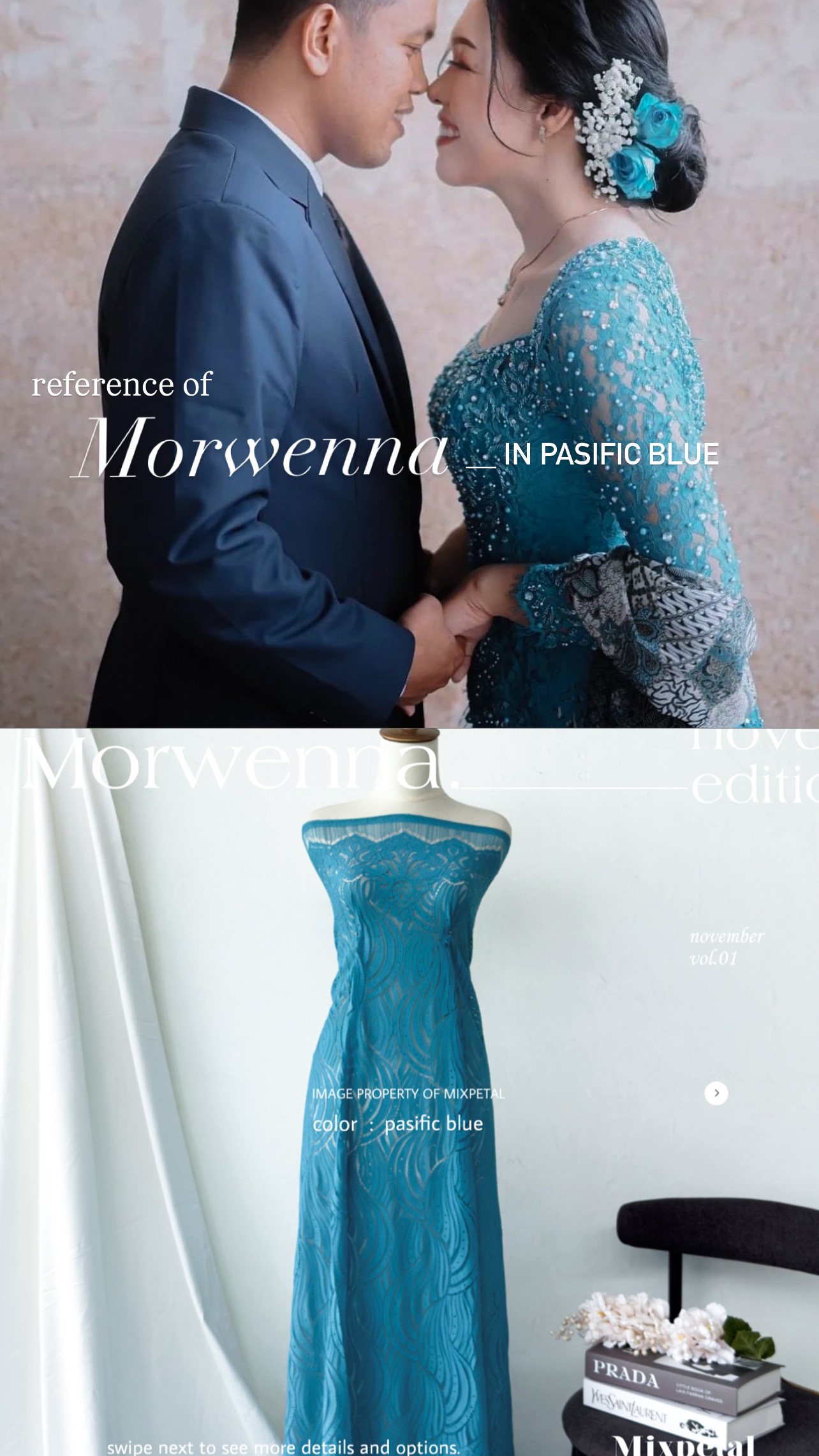 Terinspirasi dari gelombang laut yang Indah nan menawan dalam nuansa laut dan langit yang Indah, Design Morwenna kini hadir dalam detail yang elegan. Morwenna, dengan bahan dasar katun dove yang nyaman dipakai seharian dalam acra spesial anda. Bahan dasar semi italy yang kokoh untuk di padu dengan payetan spesialmu.